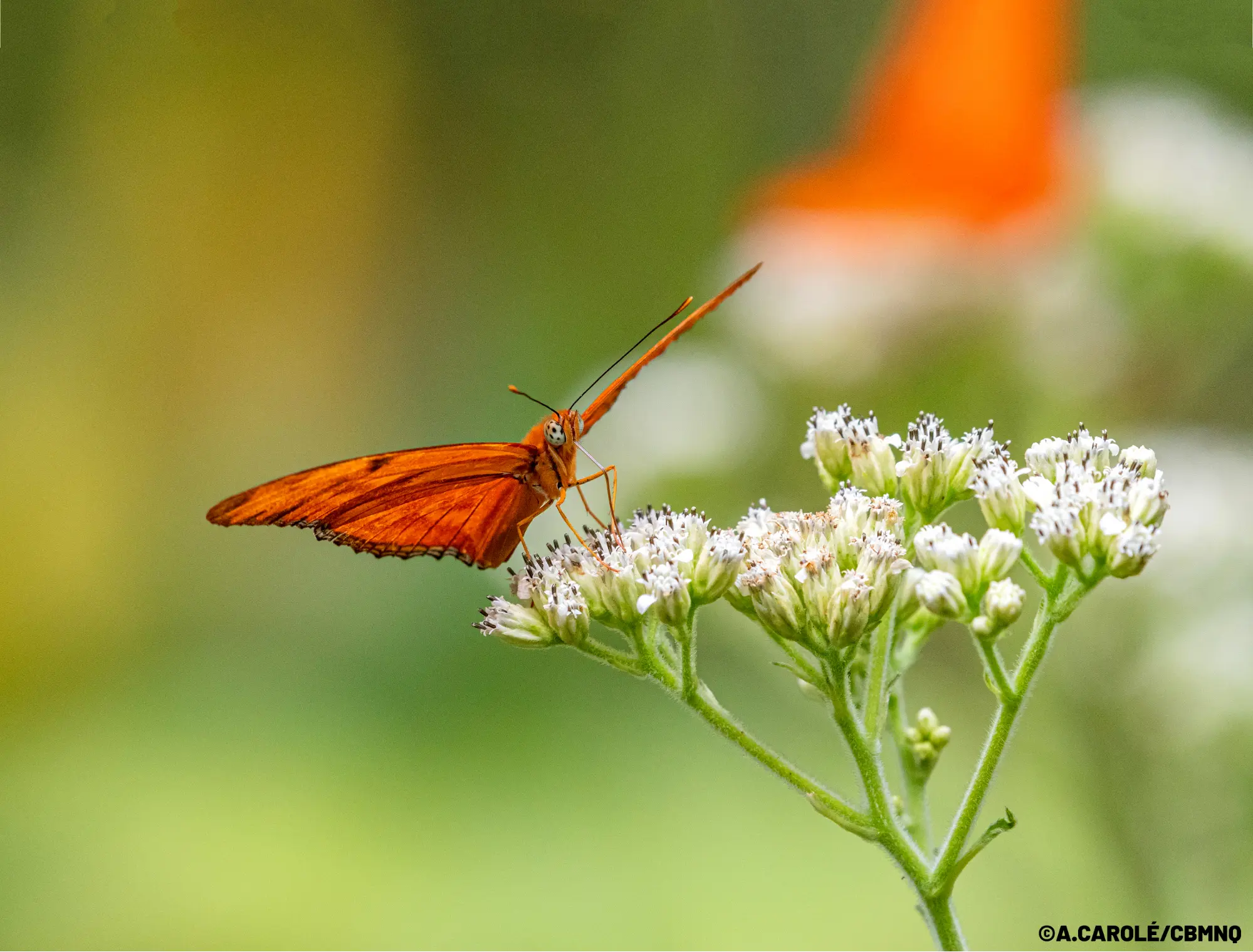- Dryas iulia (Fabricius), NYMPHALIDAE, papillon “Flambeau” butinant une inflorescence de Verbesina gigantea Jacq., ASTERACEAE, “Kanmonmiy” au Morne Larcher, le Diamant..